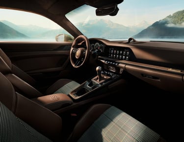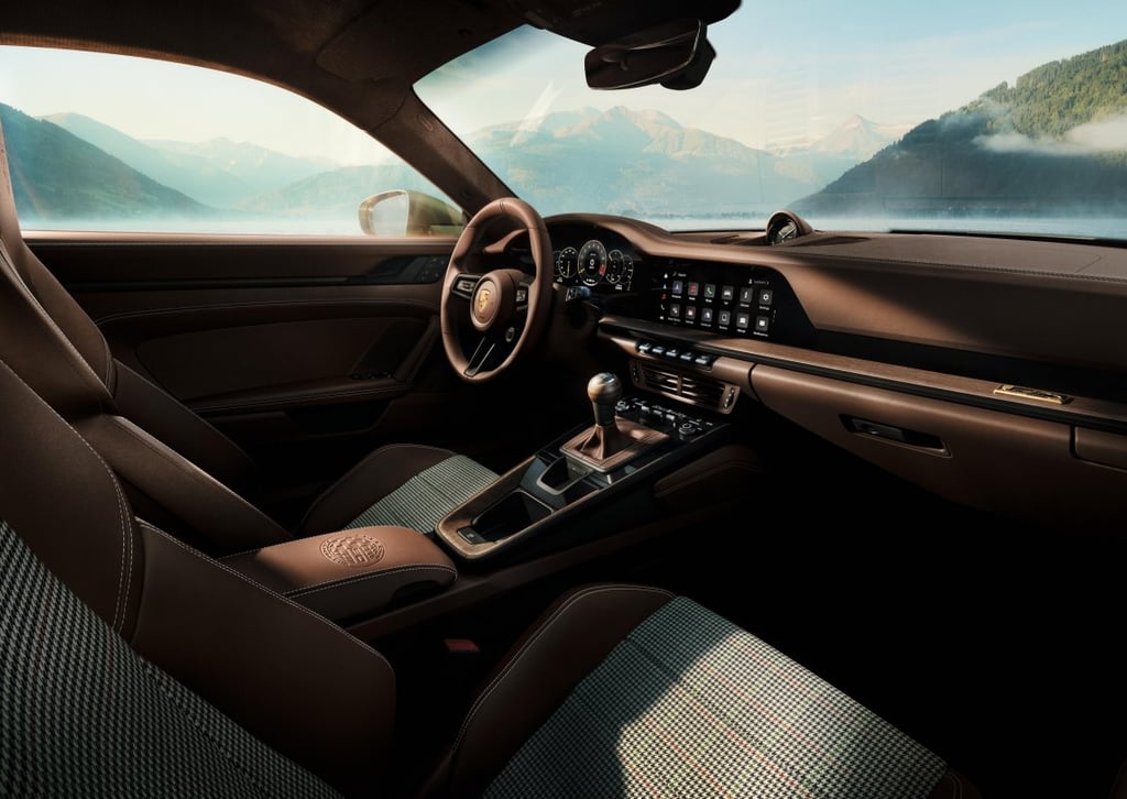 Декоративните шевове в цвят Chalk Beige и централните панели на седалките, изработени от специален плат F.A. Grid-Weave, допълват кожената тапицерия Truffle Brown Club и създават специална атмосфера, в памет на Ф.А. Порше.
