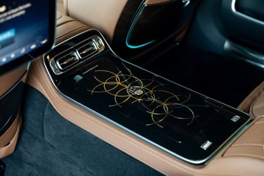 Централната конзола е с емблема „1 of 50“, специални декоративни шевове и възглавници с логото Maybach. В задната конзола е инкрустиран елемент с истински златни детайли, а покривната облицовка в традиционното кафяво с диамантен капитонаж завършва изисканата атмосфера.