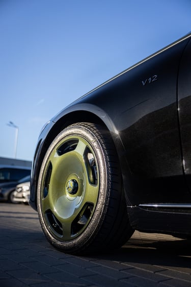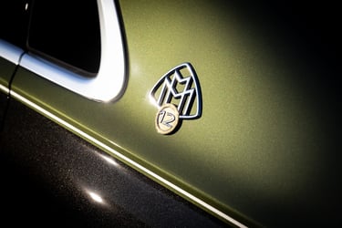 Впечатляващият Mercedes-Maybach V12 Edition носи елегантна двуцветно лаково покритие, което комбинира наситен маслено-зелен нюанс в горната част и дълбоко металическо черно в долната. Цялостната визия е завъшена с искряща сребриста декоративна линия. Специфичните 5-лъчеви ковани джанти в същият отличителен зелен цвят и емблемата на Mercedes-Maybach на С-колоната придават завършеност и ексклузивност, като напомнят за историческото лого на ранните модели Zeppelin.