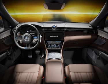 Интериорът на Lumina Blu по същия начин отдава почит на италианското savoir-faire, демонстрирайки майсторската изработка и естетическото изящество на марката с тризъбеца. Кабината – тапицирана в първокласна кожа Chocolate или алтернативно в първокласна кожа Ghiaccio, и украсена с елементи от дърво burl с отворени пори и спортни стоманени педали – съчетава естествени материали и авангардни технологии, за да изрази най-автентичната същност на Maserati – символ на италианския лукс по света.