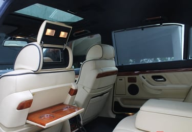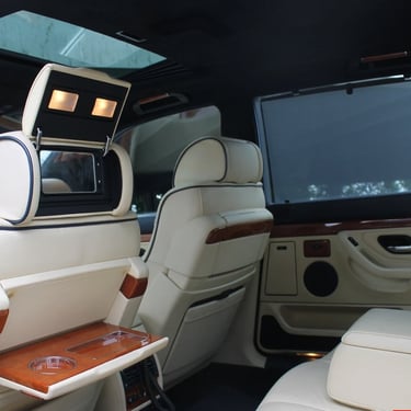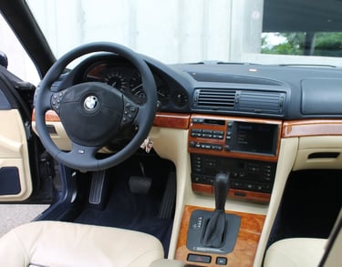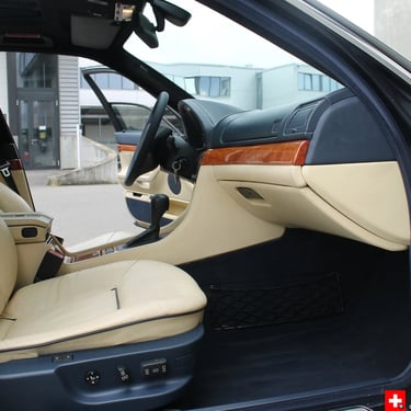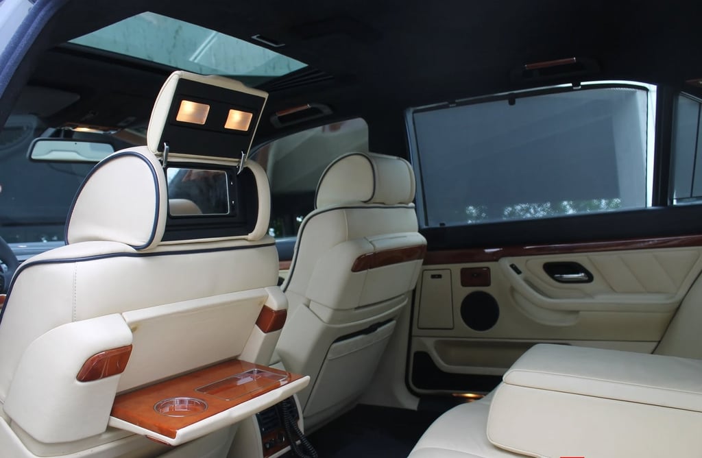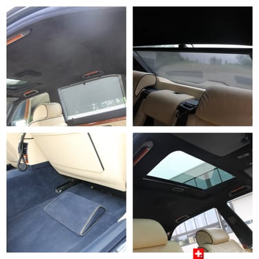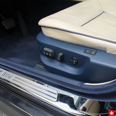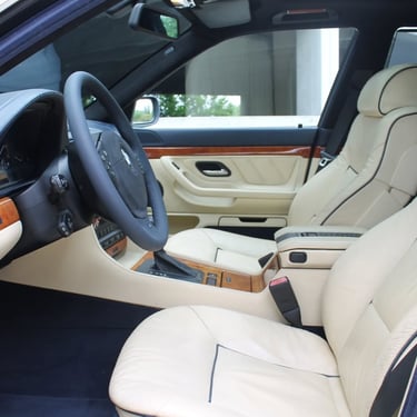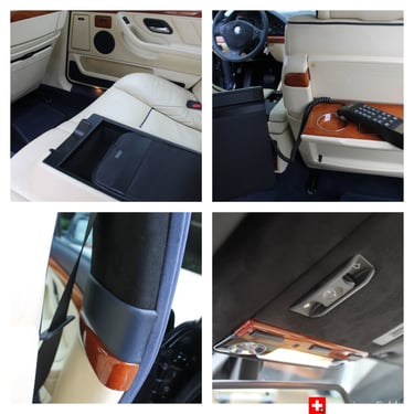 Този автомобил се предлага в елегантния и рядък цвят Night Blue Metallic, комбиниран с изцяло кожен интериор по поръчка в цвят шампанско и тъмносиньо със сини кантове – наистина великолепна комбинация, която вече не се произвежда днес. Дори подовите стелки, панелите на вратите и воланът са педантично изработени в тъмносиньо. Декоративните апликации са изработени от специална дървесина, добита от дърво на име Брюер - рядък вид, който расте по Средиземноморието, отличава се с изключителна твърдост и усточийчивост на суша и всъщност е далечен роднина на шипковия храст. Автомобилът е в състояние почти като чисто нов – без никаква ръжда. Напълно оригинален, без самоделни преправяния. В задната част ви очаква чист лукс: електрически регулируеми комфортни седалки със сгъваеми масички – тук ще пътувате като в частен самолет.