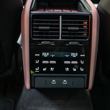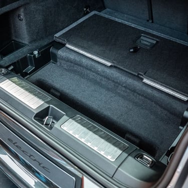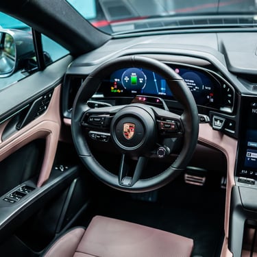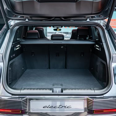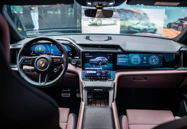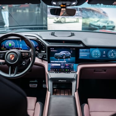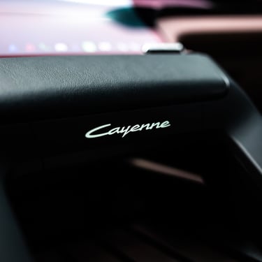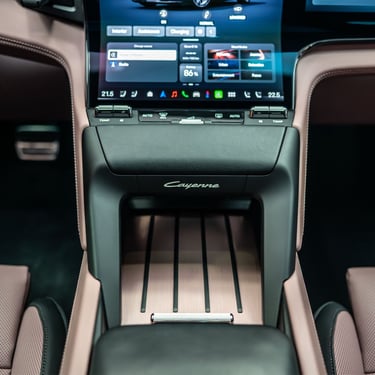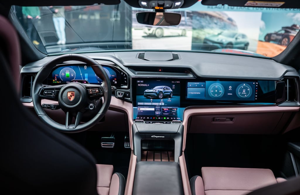 Интериорът на Cayenne Electric е модерен, високотехнологичен, просторен и извънредно луксозен - точно както и подабава на елитен модел от подобен калибър. Нещото, по което вътрешността на електрическия Cayenne се отличава най-силно от стандартния модел, е съвкупността от три огромни екрана - един за приборното табло зад волана, един за управление на инфо-развлекателната система и функциите в автомобила на централната конзола (с иновативна, за първи път приложена в този си вид извита технология) и трети, разположен пред пасажера. Естествено, всеки от въпросните дисплеи има изключително висока разделителна способност, за да се гарантира възможно най-добро въпроизвеждане на всякакъв тип графики и изображения, а бързината и обратната връзка, която дава централно разположеният тъчскрийн, е сред най-доброто, което може да се открие на пазара към момента. Седалките с превъзходна странична опора, изобилието от свободно място във всички направления и отличният подбор на материали са задължителни за всеки Cayenne, без значение дали е на ток или не - но трябва да признаем, че при Cayenne Electric хората от Porsche са успели да достигнат до нови висоти в споменатите направления.