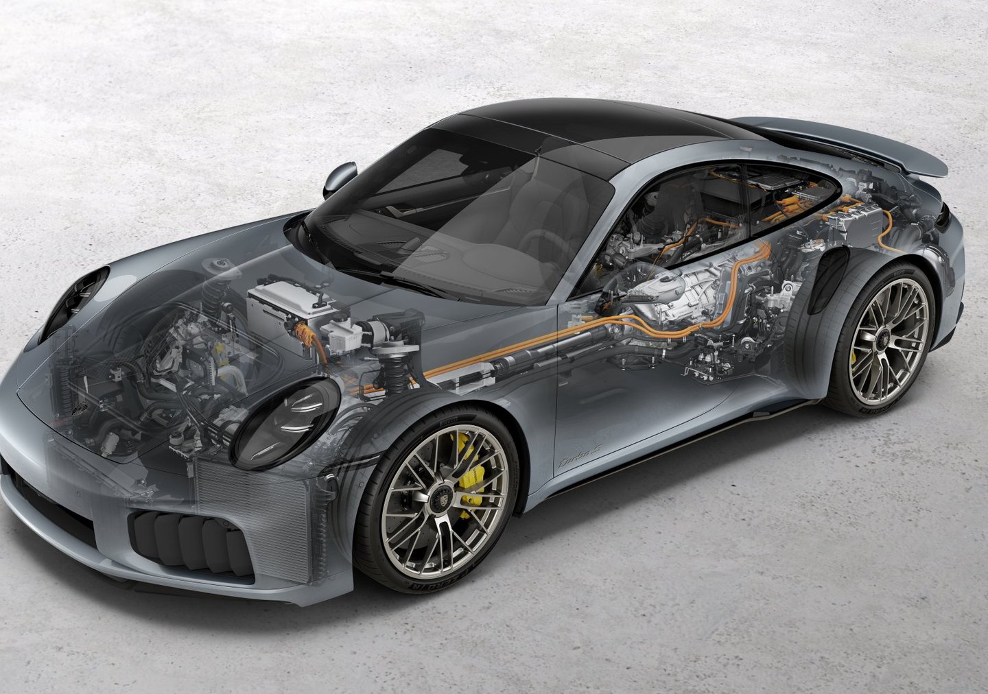Задвижването T-Hybrid дебютира за първи път през 2024 г. в 911 Carrera GTS. Впоследствие, технологията е значително доразвита за целите на новия 911 Turbo S. Докато в GTS, T-Hybrid системата включва един турбокомпресор за отработилите газове с електрическо подпомагане (eTurbo), в новия 911 Turbo S се използват два eTurbo турбокомпресора. Турбината и компресорът са специално проектирани, така че да отговорят на изискванията за динамика на модела. Двата eTurbo компресора допринасят за значителното увеличение на динамичните качества на автомобила, включително на отзивчивостта на задвижването. Изключително компактната и лека високоволтова батерия с капацитет 1,9 кВтч е същата като използваната в 911 Carrera GTS. Осемстепенна PDK с интегриран електрически мотор предава мощността към системата за задвижване на всички колела Porsche Traction Management (PTM). Времето за ускоряване от 0 до 100 км/ч на Turbo S Coupé е намалено с 0,2 секунди до 2,5 секунди в сравнение с това на предшественика. Достигането на 200 км/ч отнема само 8,4 секунди, което представлява подобрение с 0,5 секунди. Максималната скорост на новия 911 Turbo S е 322 км/ч.