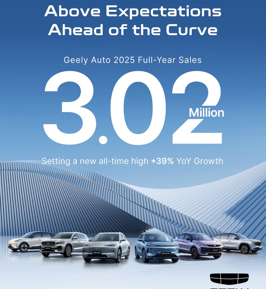 Geely Auto Group обяви резултатите си от продажбите за 2025 г. Общите продажби достигнаха 3 024 567 автомобила, което представлява ръст от 39% на годишна база и нов исторически рекорд.