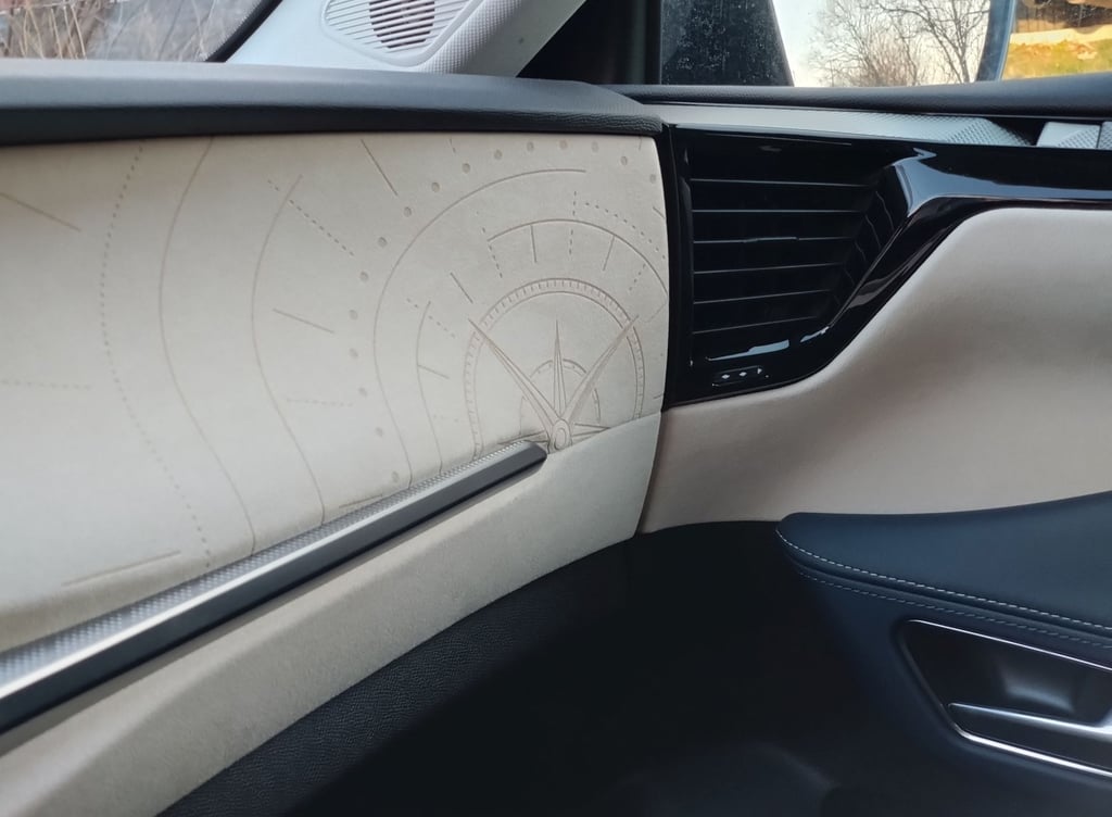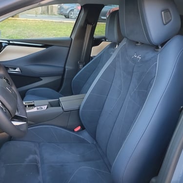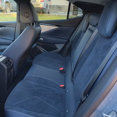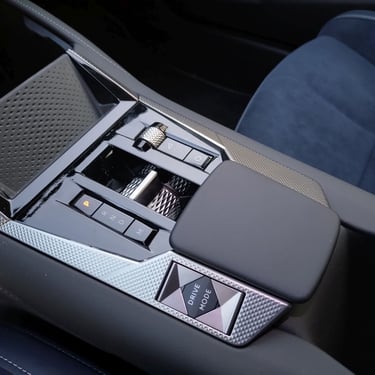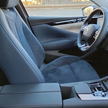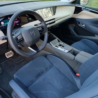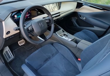 Красотата във вътрешността на DS N°4 e от друг тип - тук дизайнерите са имали възможността да се развихрят малко повече, макара и отново съобразявайки се с наличните реалности при едросерийните модели на концерна Stellantis. В интериора на този модел можете да откриете примери за изискани материали, изящни и сложни за изпълнение дизайнерски решения, нетрадиционно оформени детайли и дори тук-там на ръчно изработени детайли - да, бутиковият автомобилен лукс с качество на първокласна манифактура изглежда другояче (и има съвсем различна цена), но на фона на все по-тривиално изглеждащите автомобилни интериора в по-масовите класове, вътрешността на DS N°4 се усеща като оазис на разкоша сред пустиня от посредственост. Самият факт, че счетоводителите в голям автомобилен концерн са допуснали влизането в серийно производство на няколко десетки вида интерпретации на ромбоидните форми, причудливи и уникални сами по себе си стилистични похвати при толкова много детайли детайли, както и разточителната употреба на алкантара и фини метални повърхности говорят, че дизайнерите на DS Automobiles са били наистина убедителни при защитата на доводите, защитаващи решенията им. За което само мога да ги поздравя. А също и счетоводителите - за това, че са направили изключение от безрадостното общо правило. Между другото, при специалната серия Jules Verne, посветена на легендарния френски писател-фантаст Жул Верн, индивидуалността се подчертава допълнително от цял куп красиви детайли като извезания в предните облегалки подпис на писателя, калиграфско изображение на компас на арматурното табло и други характерни детайли, които няма да срещнете никъде другаде. Между другото, ако споменатите вече счетоводители бяха с една идея по-ларж, щеше да е страхотно ако бяха оставили дизайнерите да направят интериора на сто процента бяло-син - защото в момента черното табло леко се бие с останалите части, решени наистина изцяло в тъмно синьо и млечно бяло - сама по себе си разкошна комбинация. Иначе комфортът в салона е на отлично ниво, позицията на седене зад волана е близка до идеалното - достатъчно ниска, за да бъде добре интегрирана в архитектурата на вътрешността и същевременно достатъчно висока, за да има водачът добър обзор във всички посоки.