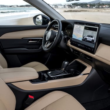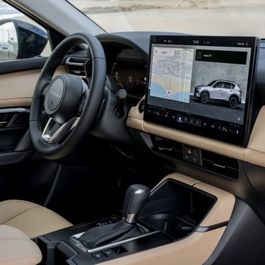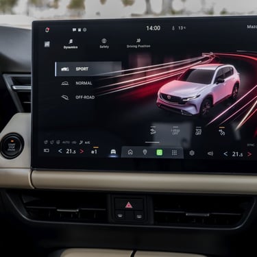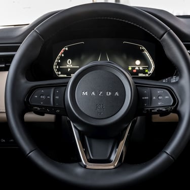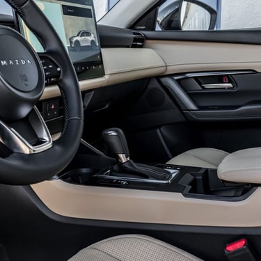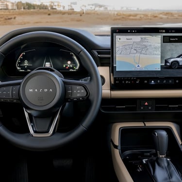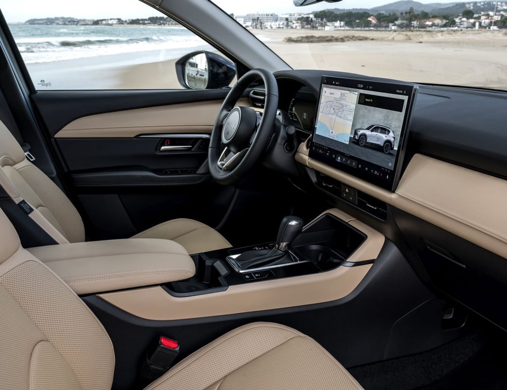 Отпред от своя страна имаме традиционно ориентиран около водача кокпит, но и напълно нова концепция за управление на функциите. Материалите са подбрани така, че да радват както не само погледа, но и останалите сетива, като това важи в най-голяма степен за разкошно обзаведеното върхово изпълнение на име Homura, което наред с останалите "благини" предлага наистина прекрасно изработена тапицерия от мека естествена кожа. Типично за марката, позицията зад волана е превъзходно проектирана от ергономична гледна точка, воланът е направен по най-добрите традици на марката - единственото, което е малко неочаквано и не на всяка цена положително, е споменатата малко по-горе нова стратегия за командване на функциите в автомобила - вместо добре познатите високо разположен екран и удобни контролери на централната конзола, при новия CX-5 човек се усеща повече или по-малко като в новата електрическа Mazda 6e – повечето неща в автомобила вече са съсредоточени в големия сензорен екран в средата на таблото. Това има някои плюсове, но и неминуеми минуси, особено когато трябва да направите нещо бързо по време на шофиране.