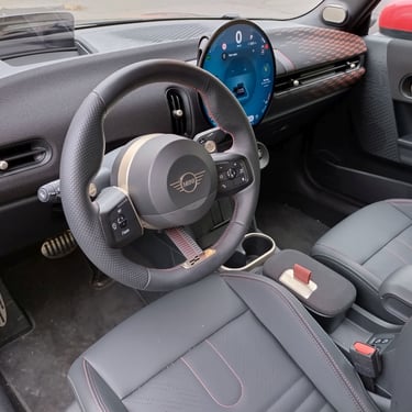 Съвременният John Cooper Works не е толкова невъздържан, екстремен и трудно предвидим, колкото беше в споменатат вече генерация R56, но това изобщо не означава, че му липсват чисти спортни и дори състезателни гени - напротив. Просто автомобилът е станал значително по-рафиниран и прецизен, без да се усеща настървен като разярен звяр при всяко по-отривисто настъпване на газта или всяко малко по-силно движение на волана. Истината е, че в сегашното си поколение MINI John Cooper Works по забележително сполучлив начин съчетава усещането за управление на картинг с прецизност и страхотно усещане за баланс, което върви ръка за ръка с реален потенциал за постигане на много сериозни стойности на странично ускорение в завоите. А пък ако говорим за надлъжно ускорение, тук двулитровият турбомотор с 231 к.с. и 380 Нм и бруталните спортни спирачки осигуряват еднакво впечатляващи стойности за положително, респ. отрицателно ускорение. Върящият момент от близо 400 Нм е наличен в много широкия диапазон между 1500 и 4000 об./мин и се стоварва върху предните колела с устрема на парен чук - истината е, че колкото миловиден изглежда този автомобил на вид, толкова неумолим става характерът му, когато решите да го подкарате с пълна газ и да изцедите пълния му потенциал за спортно шофиране.