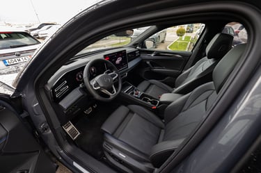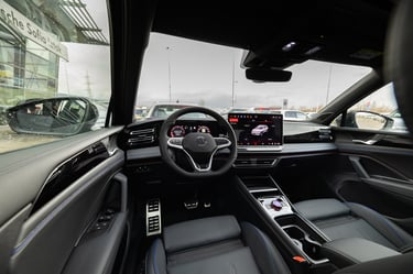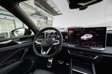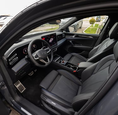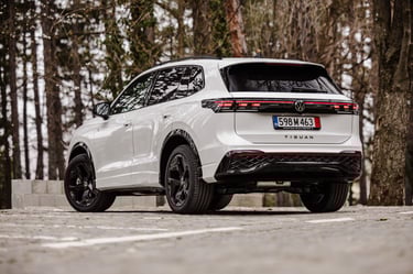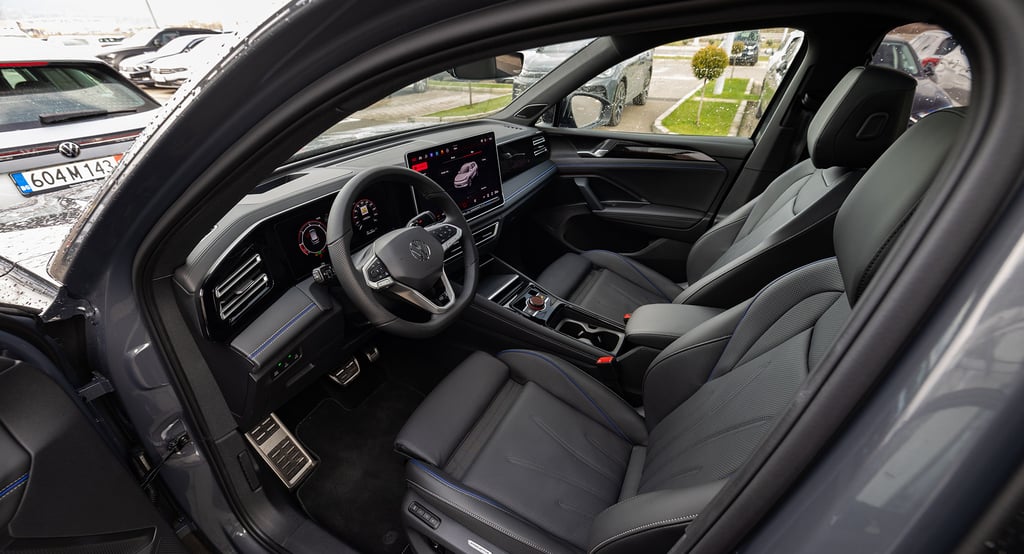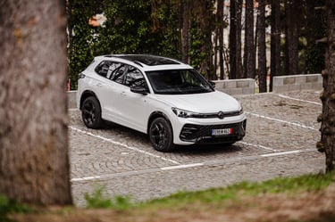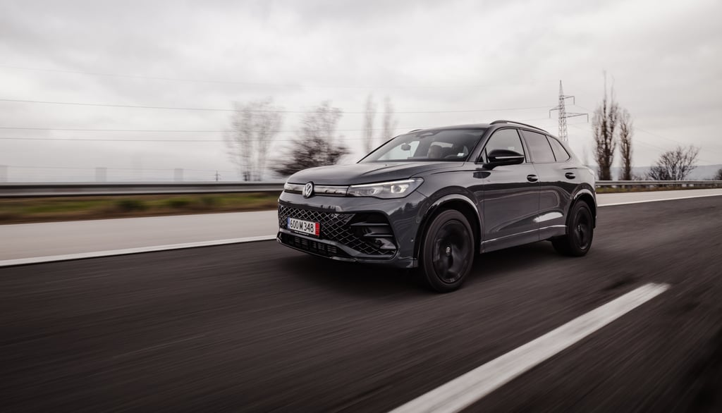 Tiguan от своя страна също се е променил доста драстично като дизайн и стил, но е като цяло е запазил размерите и пропорциите си - дължината на каросерията му е малко над четири метра и половина, но затова пък вътрешният обем е осезаемо пораснал. Мястото е изобилно както за пътниците, така и за багажа им - товарното отделение побира внушителните 652 литра, и при сгънати задни облегалки достига до над 1600 л. В този автомобил също почти няма човек, който да не се чувства комфортно и нашироко, макар че по отношението на усещането за безкраен обем, Passat си остава победител. Ергономичната концепция е нова и почти идентична и в двата модела - удобните и интуитивно бутони на волана за голяма моя радост са запазени, съхранени са и класическите контроли за повечето най-важни и най-често използвани функции. Иначе, както подобава за един нов модел, повечето неща са концентрирани в конфигурируемото дигитално арматурно табло зад волана и най-вече в огромния екран на средната конзола. Местата за съхранение на предмети са се увеличили още повече благодарение на факта, че скоростният лост е "мигрирал" от централния тунел към кормилната колонка. Само хубави думи можем да кажем и за седалките, особено за варианта ergoActive с допълнителни възможности за настройка и по-ергономични контури. Една от съществените разлики между Tiguan и Passat, и несъмнено един от сериозните аргументи за купувачите на SUV модели, е високата позиция на седене и добрият обзор от мястото на водача. Иначе атмосферата и в двата автомобила е доста близка, сравними са също и използваните материали, които са на наистина високо ниво. Естествено, мнозина се вълнуват от неща като свързаност и асистиращи системи, като тук всичко е на висотата на времето и дори на върха на предлаганото в съответните два сегмента. Ако пък не държите на този тип технологии, те никога няма да ви се сторят твърде натрапващи и задължаващи, което е добре.